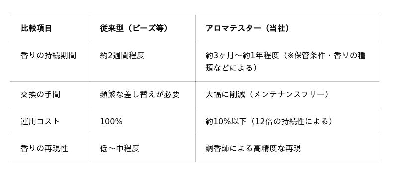 従来主流であったビーズタイプの香り見本では実現が難しかった「香りの持続性」「再現性」「運用コスト」の課題を解決したのが当社の「アロマテスター」です。香りの持続性・再現性・コストパフォーマンスにおいて大きな優位性を持つ、次世代の香り見本として多くの企業に採用されています。導入企業からは「製品の香りをしっかり体感できる」「店頭に長期間設置しても香りが持続する」