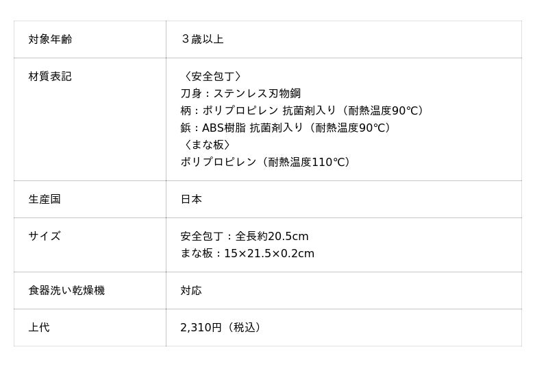 これらの特長により、本製品は「はじめての包丁」として家庭での親子調理や食育シーンに適したこども用調理器具となっています。