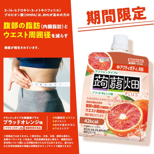 【機能性表示食品】BMIが高めの方の腹部の脂肪とウエスト周囲径を減らす!3月2日(月)「クラッシュタイプの蒟蒻畑プラス」からブラッドオレンジ味が新発売!