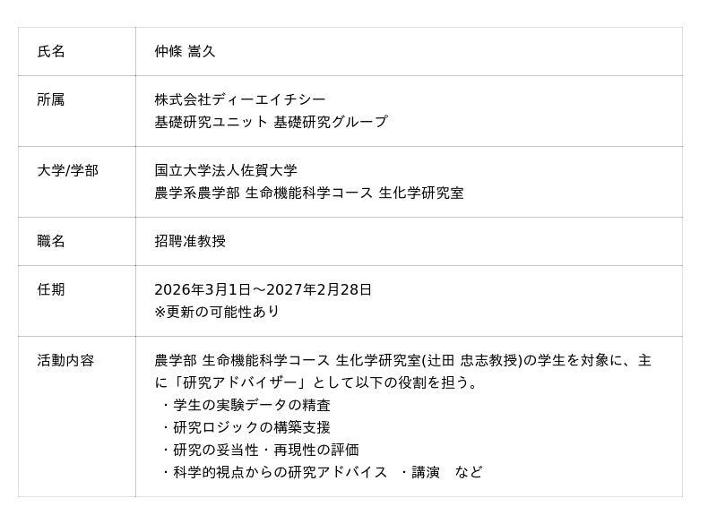 株式会社ディーエイチシー(本社:東京都港区、代表取締役社長:宮崎緑、以下:DHC)は、2026年3月1日(水)付で、DHC基礎研究ユニット基礎研究グループの仲條 嵩久が国立大学法人佐賀大学(学長:野出孝一、以下:佐賀大学)農学部 生命機能科学コース 生化学研究室の招聘准教授に、就任したことをお知らせいたします。
