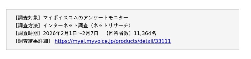 調査結果を掲載・引用いただく場合は、必ず「マイボイスコム調べ」もしくは「マイボイスコム(株)調べ」と表記をお願いいたします。