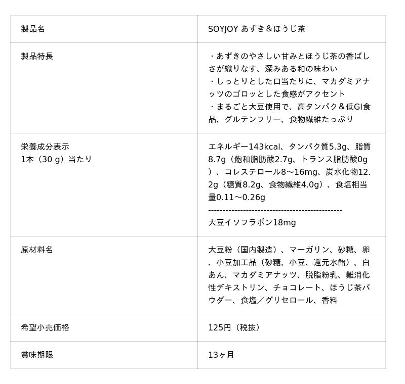 今回発売する新製品は、大豆の栄養価や低GI食品といったSOYJOYの特長はそのままに、健康的で食事にも合う身近な和の素材である“あずき”と“ほうじ茶”を組み合わせることで、香り高いフレーバーを実現しました。大豆に含まれるタンパク質や食物繊維などの不足しがちな栄養をおいしく摂れる製品に仕上げています。