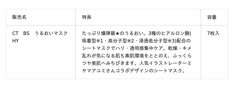 コーセーコスメポート株式会社コーセーコスメポート株式会社(本社:東京都中央区、代表取締役社長:小林 孝雄)は、スキンケアブランド『クリアターン』において、人気イラストレーターミヤマアユミさんとコラボレーションした、水分量やキメをととのえふっくらツヤ美肌へみちびく「ヒアルロンBOMBマスク」(1品目1品種、ノープリントプライス)をウエルシアグループ・イオングループ・ツルハグループ(一部店舗除く)にて、2026年4月1日から数量限定で順次店頭発売します。