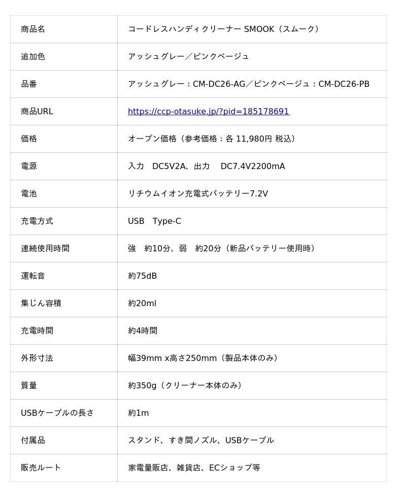 CCP株式会社シー・シー・ピー(東京都台東区、代表取締役社長:横治 一也)は、『コードレスハンディクリーナー SMOOK(スムーク)』(オープン価格)に新色を追加いたします。