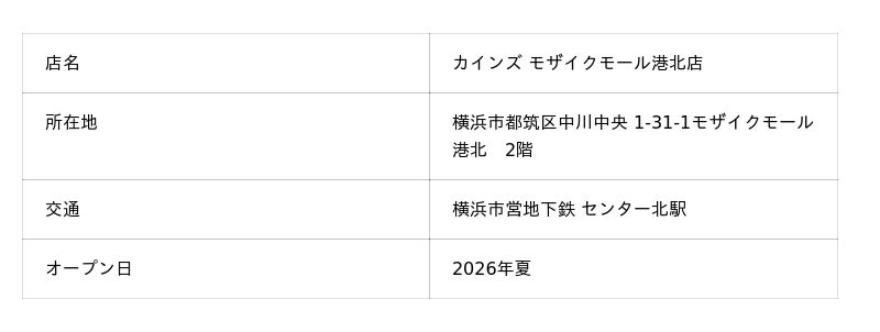 株式会社カインズ(本部:埼玉県本庄市、代表取締役社長 CEO:高家 正行)は、2026年夏に「カインズ モザイクモール港北店」が、株式会社阪急商業開発が運営する横浜市都筑区のショッピングセンター「モザイクモール港北」2階にオープンすることをお知らせします。