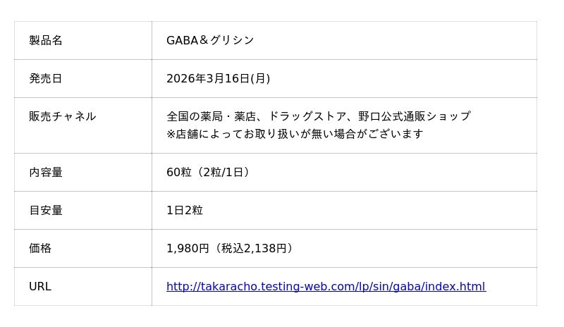 株式会社野口医学研究所は、働き盛り世代の毎日のコンディション維持をサポートするサプリメント、「GABA&グリシン」および「セサミン&発酵エキス」を、2026年3月16日(月)に発売します。
