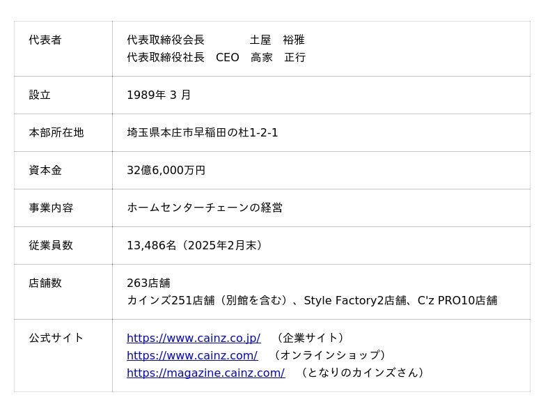 株式会社カインズは、29都道府県下に263店舗を展開するホームセンターチェーンです。「くらしDIY」をブランドコンセプトに、くらしを豊かにする価値ある商品・サービスを開発し、お値打ち価格で毎日提供します。Kindness(親切心)と創意工夫のアイデアあふれる店舗づくりに努めることで、お客様一人ひとりの、ご家族の、そして地域の日常を楽しいものとし、お客様とのプロミスである「くらしに、ららら。」をお届けします。