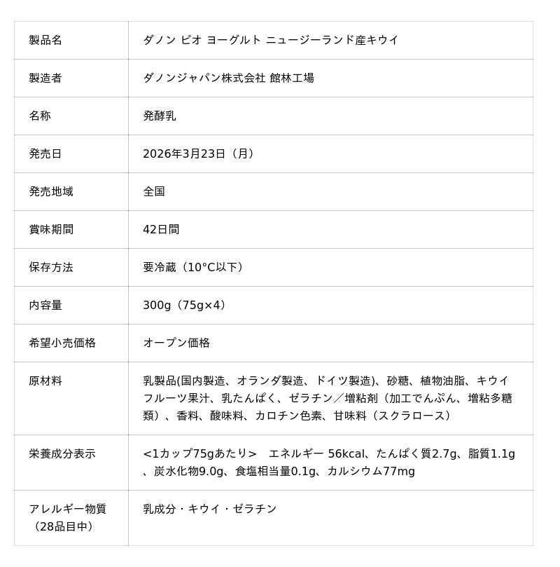 ダノンジャパン株式会社(本社:東京都目黒区、代表取締役社長:ロドリゴ・リマ)は、100倍胃酸に強く※1、生きて腸まで届くBE80菌を配合した「ダノン ビオ(R)」ブランドより、新フレーバー「ニュージーランド産キウイ」を、全国スーパーマーケットにて2026年3月23日(月)より発売します。
