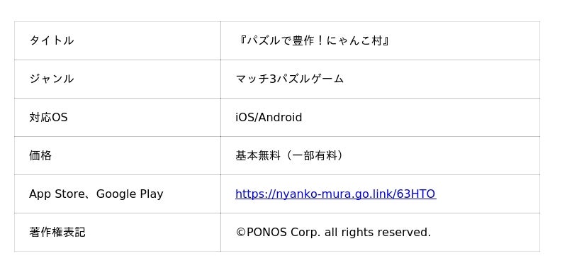 ポノス株式会社(本社:京都府京都市、代表取締役:辻子依旦)は、2026年3月10日(火)から『パズルで豊作!にゃんこ村』の初のリアルイベント「パズルで豊作!にゃんこ村 出張直売所 in 西武渋谷店」と「にゃんこ大商店 出張所 ~開運招福!~」を同時開催しています。