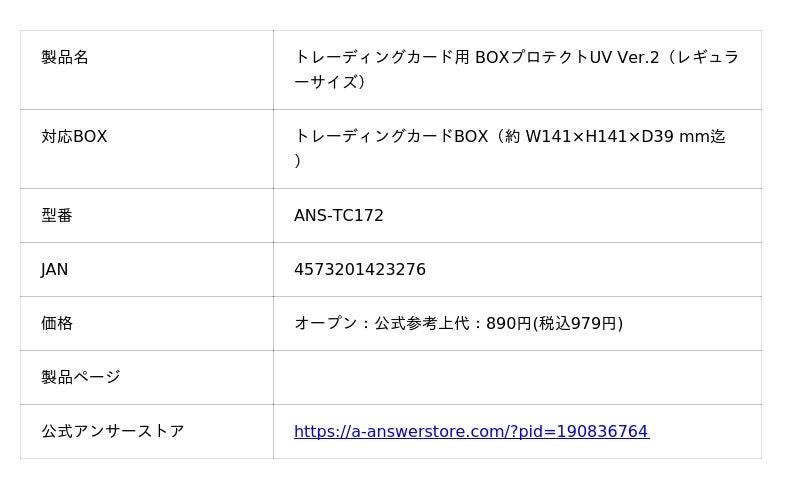 ゲーム周辺機器・トレカサプライメーカーのアンサー株式会社(本社:大阪府大阪市中央区、代表取締役社長:有村 勇志)は、大人気のトレーディングカードBOXを保護する超硬質ケース「トレーディングカード用 BOXプロテクトUV Ver.2(レギュラーサイズ)」を、公式アンサーストア、全国の家電量販店、小売店、専門店、インターネットショップ等にて順次販売を開始することをお知らせいたします。