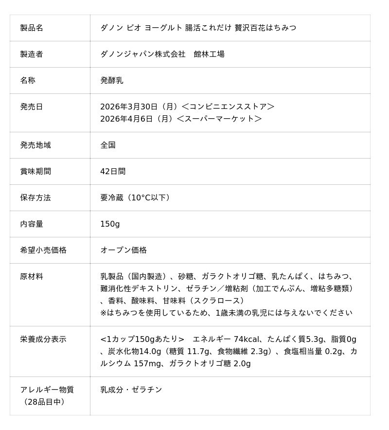 ダノンジャパン株式会社(本社:東京都目黒区、代表取締役社長:ロドリゴ・リマ)は、100倍胃酸に強く※1、生きて腸まで届くBE80菌を配合した「ダノン ビオ(R)」の「腸活これだけ」シリーズにおいて、新フレーバー「贅沢百花はちみつ」を、2026年3月30日(月)より全国のコンビニエンスストアにて、4月6日(月)より全国のスーパーマーケットにて発売します。