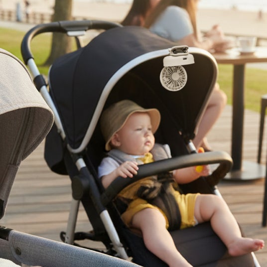 日傘の中棒やリュックのショルダーストラップ、ベビーカーなどにクリップで取り付け、移動中でもハンズフリーで風を送ることができます。