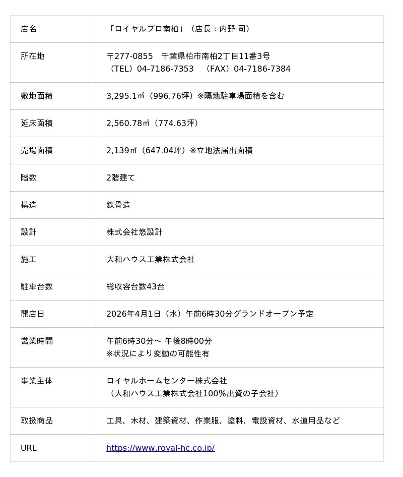 大和ハウスグループのロイヤルホームセンター株式会社(本社:大阪市西区、社長:中山正明)は、2026年4月1日(水)、千葉県柏市南柏において、「ロイヤルプロ南柏」をオープンします。