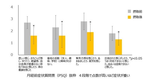 結果、「ゆううつ・落ち込んだ感じ」「興味がわかない」「無気力感」「圧倒された感じ」といった主に精神的な症状(心身の不調)の項目で大きくスコアが改善されていることが明らかとなりました。Pediococcus属の乳酸菌を直接飲用することでPMSによる心身の不調を改善するという臨床試験結果は世界でも希少な報告例となります*1。