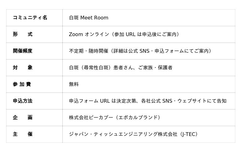 紫外線対策ウェアブランド:エポカルを展開する株式会社ピーカブー(本社:埼玉県新座市、代表取締役:松成紀公子)と、再生医療等製品の研究開発・製造・販売を行うジャパン・ティッシュエンジニアリング株式会社(J-TEC、本社:愛知県蒲郡市)は、白斑(尋常性白斑)患者さんとそのご家族を対象としたオンラインコミュニティ「白斑 Meet Room」をウェブ上で共催する予定です