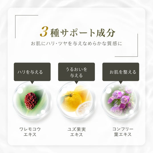 ワレモコウエキス(ハリ感をサポート)、ユズ果実エキス(保湿成分)、コンフリー葉エキス(肌を整える)が、なめらかな肌印象へと整えます。