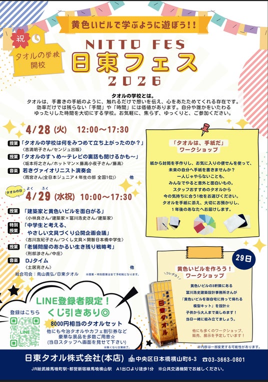 日東タオル株式会社4月29日、日東タオルは「タオルは手紙だ」を掲げる学び舎「タオルの学校」を開校します。開校記念となる「日東フェス2026」では、多彩な授業や企画が盛りだくさん。Peatixで事前予約スタート!