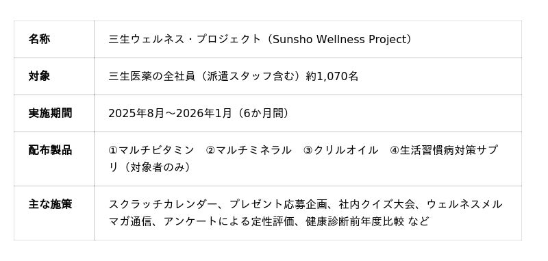 ● 健康食品・サプリメントの受託製造を手がける三生医薬株式会社(本社:静岡県富士市、代表取締役社長:今村 朗)は、2025年8月から2026年1月まで実施した社内福利厚生施策「三生ウェルネス・プロジェクト(Sunsho Wellness Project)」の実施結果をとりまとめましたので、お知らせいたします。