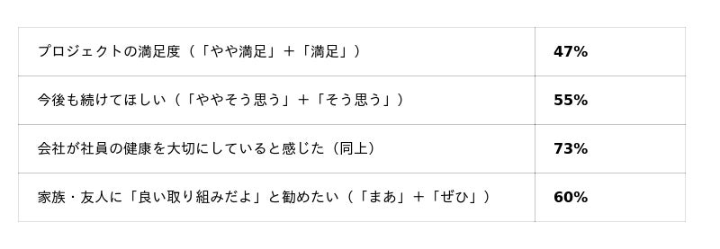 本プロジェクトに対する評価として、社員エンゲージメントに関わる指標で高い肯定率が得られました。特に「会社が社員の健康を大切にしていると感じた」は73%に達し、全社的な福利厚生施策としての存在意義が明確に示されました。