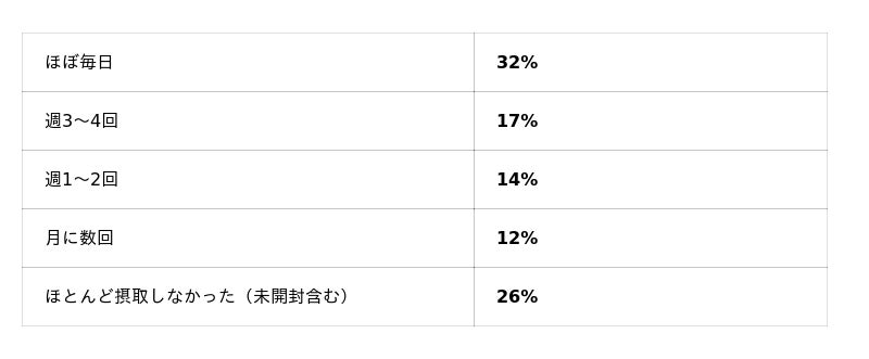 サプリメントの摂取頻度では、「ほぼ毎日」摂取した社員が32%、「週3~4回」が17%となり、合計49%が高頻度で継続して摂取していました。一方で、「ほとんど摂取しなかった(未開封含む)」という回答も26%あり、継続のしやすさを高める工夫の必要性も見えてきました。▶ 摂取頻度の分布