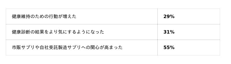 本プロジェクトでは、サプリメント摂取そのものにとどまらず、社員の健康意識や日常行動にも変化が見られました。「健康維持のための行動が増えた」は29%、「健康診断の結果をより気にするようになった」は31%となり、健康への関心が実際の行動につながる兆しが確認されました。また、「市販サプリや自社受託製造サプリへの関心が高まった」は55%となり、社員が自社の事業領域や製品価値に対して理解を深めるきっかけにもなりました。
