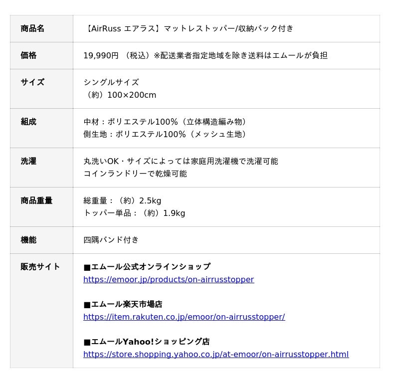身体に合った「寝る・座る・たたむ」を提供する健康家具ブランドEMOORを展開する株式会社エムール(東京都立川市:代表取締役 高橋 幸司/以下エムール)は、2026年4月6日より、重ねるだけで寝心地をアップデートする【AirRuss エアラス】マットレス トッパー(以下、AirRussマットレストッパー)の販売を開始しました。