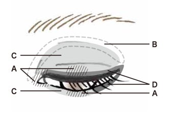 2. Bを上まぶたのCと肌との境目をぼかすようにブラシで入れます。
