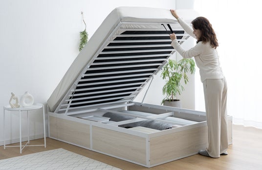 本製品は、スムーズな開閉をサポートする「ガス圧式」を採用しました。これによりマットレスを置いたまま楽に開閉することが可能です。