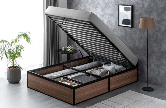 床板を持ち上げて開閉するため、引き出しを引くための余分なスペースを確保する必要がなく、ベッドの設置面積だけで大容量の収納スペースを確保することが可能です。