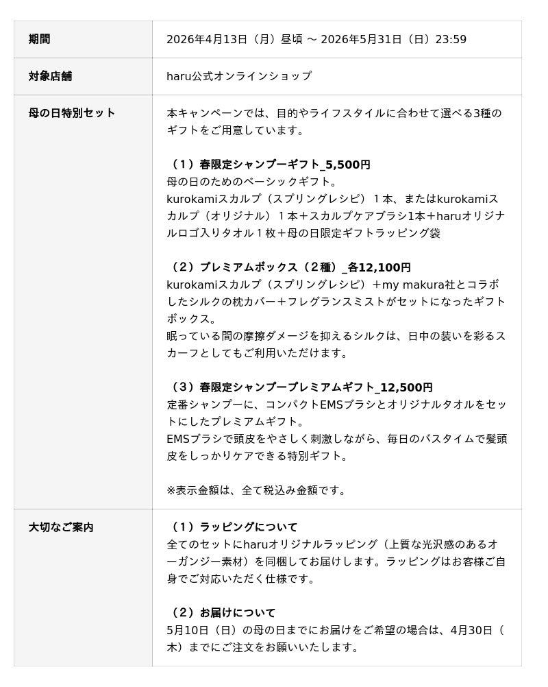 kurokamiスカルプ(haruシャンプー)でおなじみの、ヘッドビューティブランド「haru」を展開する株式会社nijito(本社:東京都港区/EC事業:福岡市中央区)は、母の日に向けたキャンペーンを2026年4月13日(月)より開始いたします。