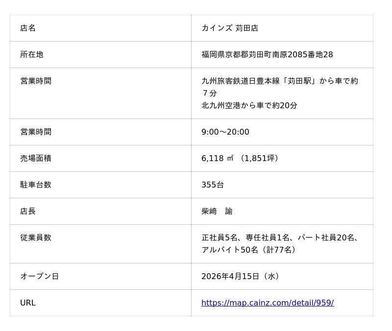 株式会社カインズ(本部:埼玉県本庄市、代表取締役社長 CEO:高家 正行)は、カインズ 苅田店が2026年4月15日(水)に、福岡県苅田町にグランドオープンすることをお知らせします。