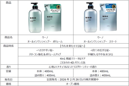 1992年のブランド誕生以来、メンズビューティーケアを通して男性の新たな魅力を引き出す伴走者として、市場に新たな価値と常識を生み出してきたunoがこの春に新CMと共にお届けするのは、「今も未来もキメる」4Dオールインワンシャンプー。男性特有の“ガシガシ洗い”などの習慣に着目し、「シャンプー」「トリートメント」「スカルプケア」「ベースデザイン」の4つの機能を1本に集約した設計で、今の髪だけでなく未来の髪まで見据えたケアを提案しています。
