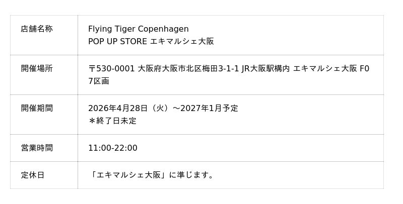 Zebra Japan株式会社北欧デンマーク・コペンハーゲンで誕生し、ヨーロッパを中心に世界中に店舗を展開するユニークなデザイン雑貨ストア Flying Tiger Copenhagen(運営:Zebra Japan株式会社/本社:東京都渋谷区神宮前/代表取締役:松山恭子)は、2026年4月28日(火)より、大阪府大阪市にあるJR大阪駅構内の駅ナカ商業施設「エキマルシェ大阪」にて、期間限定のPOP UP STOREを開催します。今回の催事を通して、ブランド未体験の方にも、Flying Tiger Copenhagenらしい楽しいショッピング・エクスペリエンスをご提供していきます。