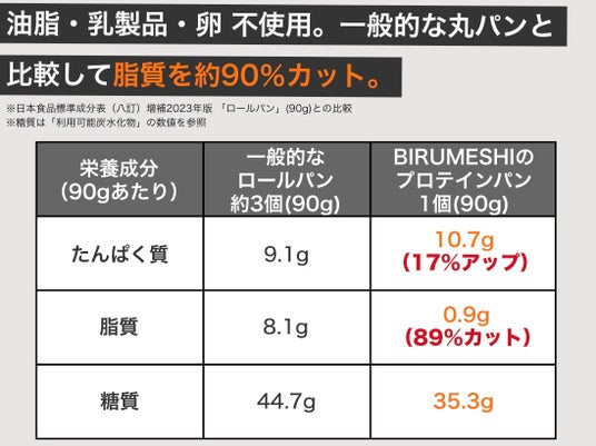 通常のパンに使用されるバターやマーガリンなどの動物性油脂に加え、乳製品および卵も使用せずに製造することで、油脂に頼らずたんぱく質量を確保しながら、脂質0.9gという低い数値を実現しました。