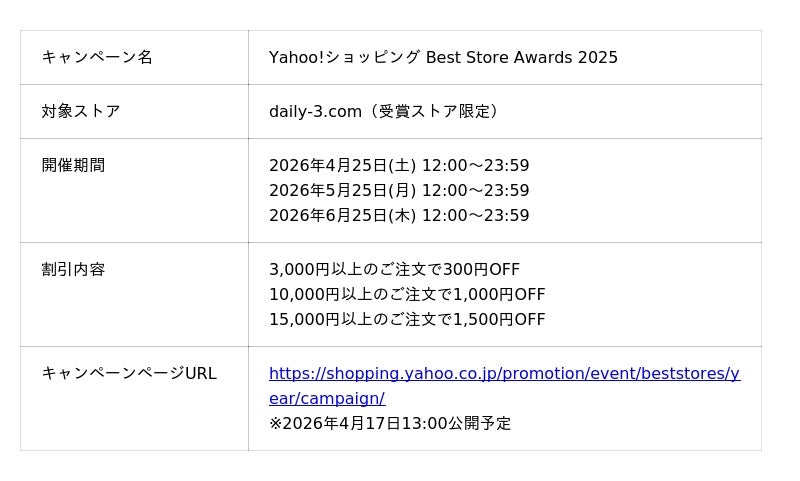 これらの施策が総合的に評価され、第2位を受賞しました。受賞を記念し、Yahoo!ショッピング主催の受賞ストア限定キャンペーンを実施いたします。この機会に、daily-3.com でお気に入りの商品をお探しください。