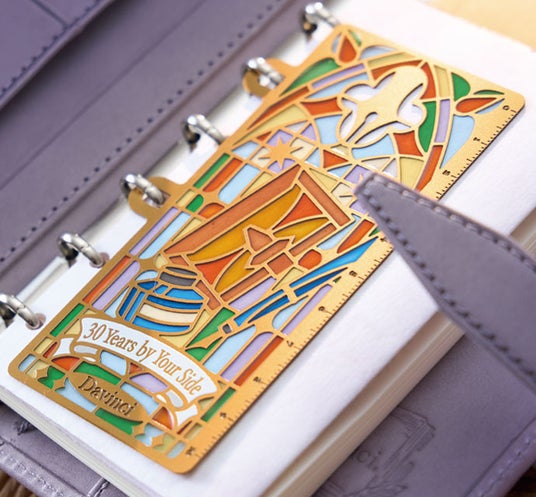 ・「30周年記念ステンドルーラー」付き:手帳と筆記具をステンドグラス風にデザインし、ブラウンゴールドメッキを施した限定ルーラーがセットになっています 。