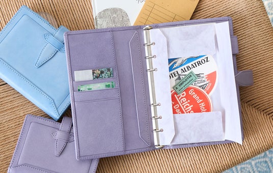 下敷きには皮革繊維再生複合材を採用し、やわらかな書き心地を実現。スタンプマットとしても最適です。スリット入りなので、リングを開閉することなく簡単に着脱できます。