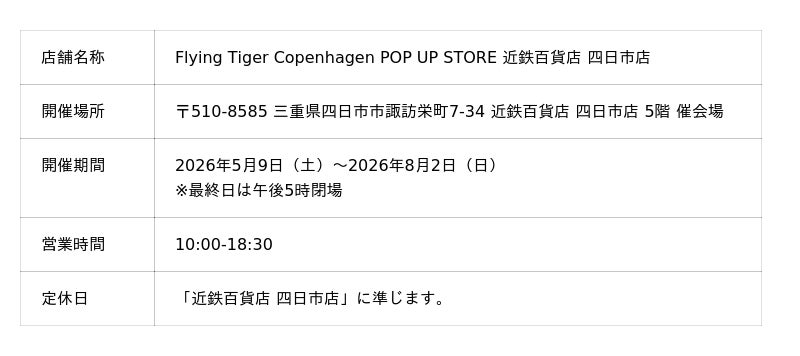 Zebra Japan株式会社北欧デンマーク・コペンハーゲンで誕生し、ヨーロッパを中心に世界中に店舗を展開するユニークなデザイン雑貨ストア Flying Tiger Copenhagen(運営:Zebra Japan株式会社/本社:東京都渋谷区神宮前/代表取締役:松山恭子)は、2026年5月9日(土)より、三重県四日市市の百貨店「四日市近鉄」の5階催会場にて、大好評だった昨年(※2025年5月23日(金)~2025年7月28日(月)実施)に続き、期間限定のPOP UP STOREを開催します。今回の催事を通して、ブランド未体験の方にも、Flying Tiger Copenhagenらしい楽しいショッピング・エクスペリエンスをご提供していきます。