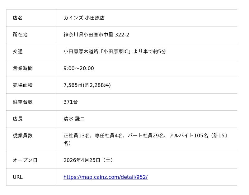 株式会社カインズ株式会社カインズ(本部:埼玉県本庄市、代表取締役社長 CEO:高家 正行)は、2026年4月25日(土)、ダイナシティ隣接地にカインズ 小田原店をオープンすることをお知らせします。